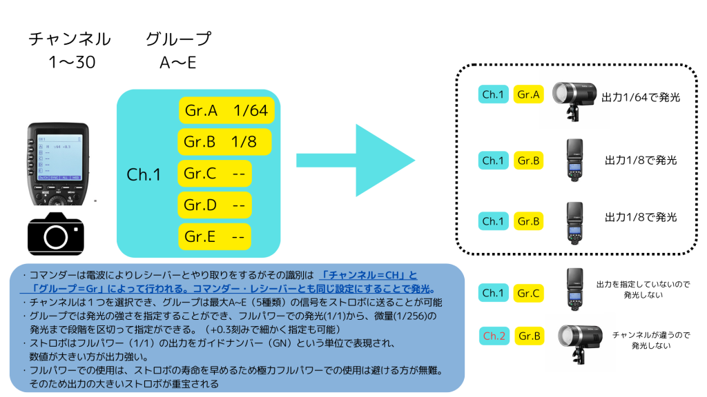 仕組みが分かったところで、使っていきたいのですが、送信機と受信機は当然ながら有線ではなく、無線による通信です。ラジオを思い浮かべていただければ良いと思いますが、ちゃんと周波数を合わせないと、音が聞こえないですよね。ストロボも同じで、送信機と受信機で同じ周波数の設定を行う必要があります。それが、「チャンネル」と「グループ」です。GODOXでは1~30のチャンネルを任意に指定することが可能です。グループはチャンネルの子供の位置づけでA~Eの最大5種類の信号を同時に送ることができます。なぜグループが必要かというと、多灯ライティングをする場合、後述するストロボの出力の強さを調整したい場面が出てきます。あるストロボは強めで発光したいが、そのたのストロボは弱めに発光したい。といった出力のバリエーションを持たせることができるものです。