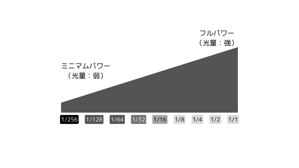 強さの表記は分数にて表され、1/1(フル発光=フルパワー)から1/256の出力まで調整ができます。