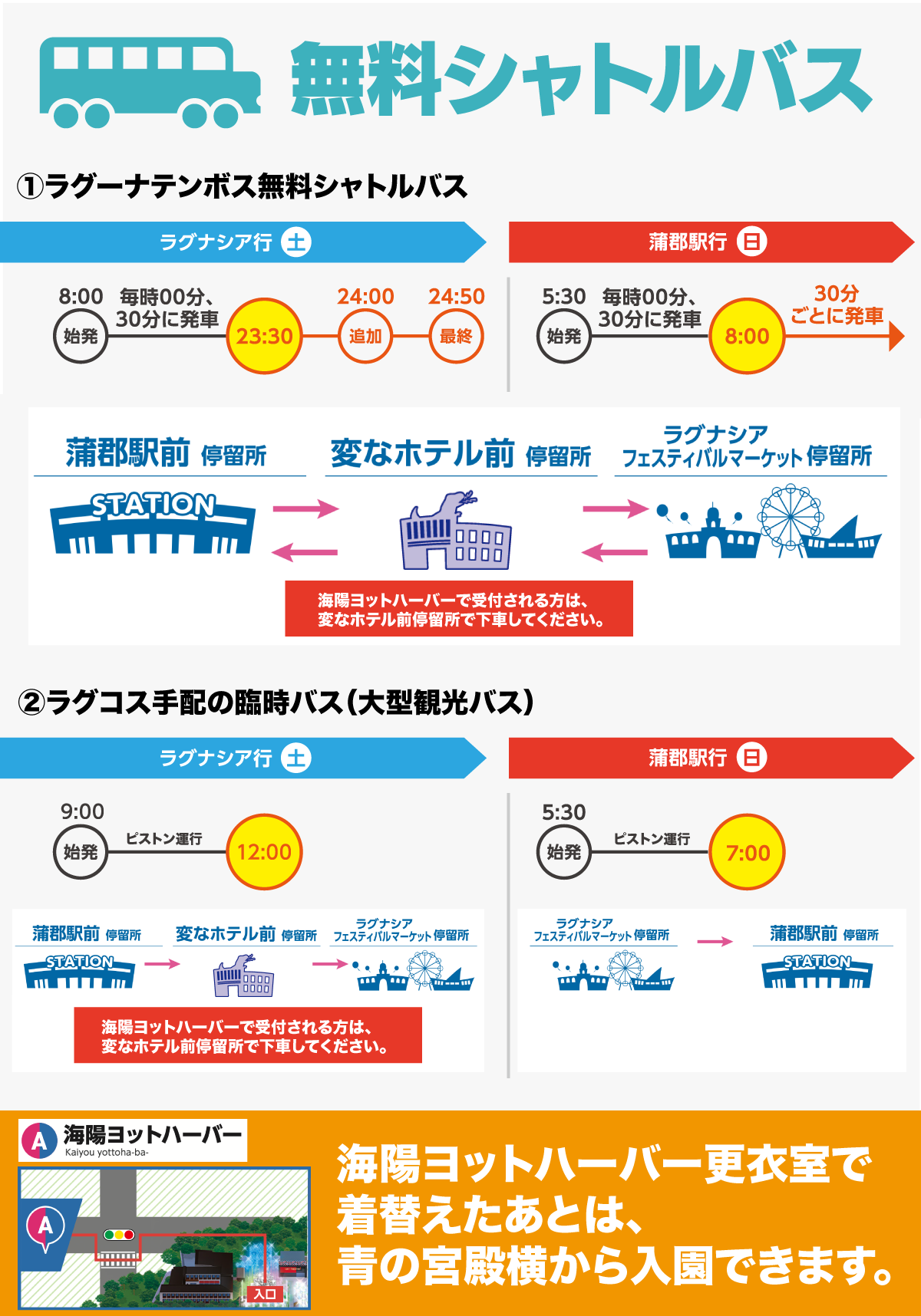 蒲郡駅(JR東海、名鉄)から無料シャトルバスが用意されています。