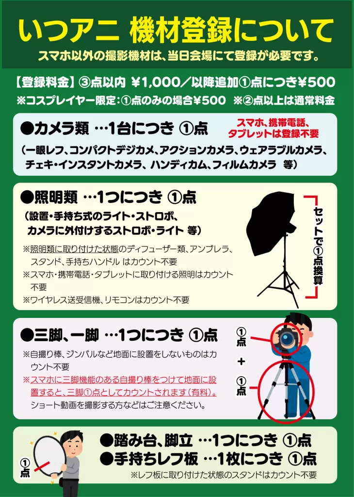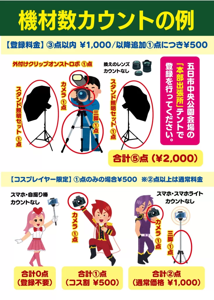 ストロボをはじめとするライティング機材も例に漏れず、大型化。その結果大量の機材を持ち込む参加者も少なくない状況で、今後も機材の肥大化は続くものと思われ、一般の方と共生しながらのコスプレイベントで新たなレギュレーションを考案。所持品の点数により登録料を取るというもの。東海地方のイベントでは、良いロケーションにも関わらず大型のライティング機材が一切が禁止されており、あまりの機材規制の厳しさに参加自体を見送るといった方も出ておりますが、本ルールは、厳しすぎるルールとせず「課金」により不必要な機材を持ち込みを控える効果が期待できる感じました。(交換用のレンズはカントされない優しい仕様w)非常に面白い考え方かつ斬新であったので、ご紹介させていただきました。